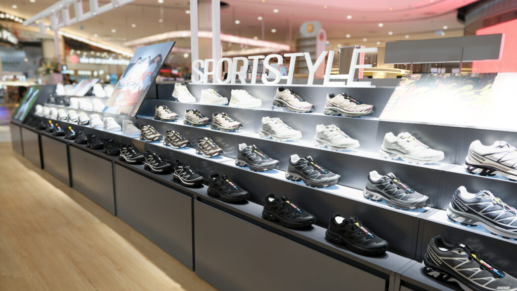 The Salomon Central WestGate store is designed to reflect the brand’s identity through dedicated product zones, featuring Outdoor Running and Sportstyle footwear such as XT-6 and XT-Whisper, along with accessories including hydration vest, socks, and other outdoor essentials.